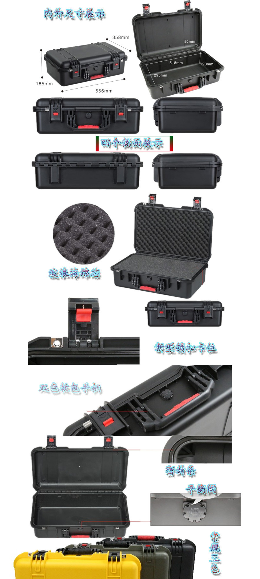 簡要說明:廣泛用于傳媒、公安、消防、軍隊(duì)、航空、戶外攝影、野外考察、科學(xué)探測等眾多領(lǐng)域的高端儀器、儀表。具有高強(qiáng)度、高抗壓沖擊、防潮、絕對密封、防塵、防水等特點(diǎn)。產(chǎn)品材質(zhì):ABS原料,箱體采用高抗沖擊的高分子聚合材料一體注塑成型,密封采用扁型彈性發(fā)泡密封橡膠條,確保防水氣密,所有較軸均采用不銹鋼材質(zhì)。